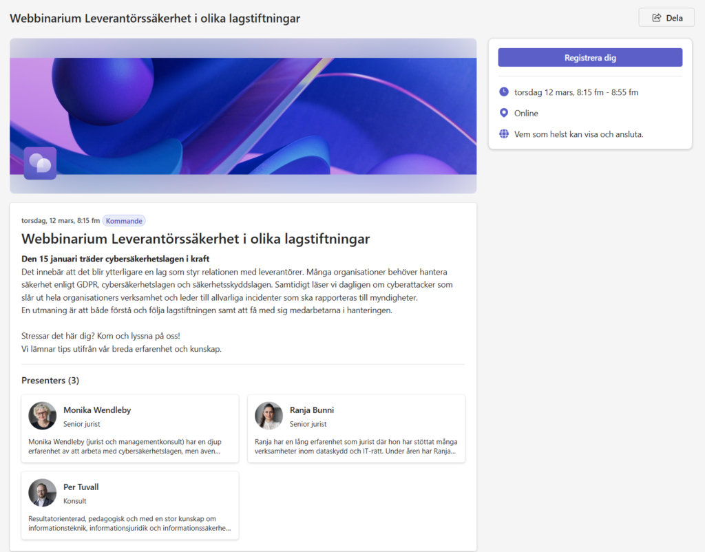Webbinarium med Monika Wendleby, Ranja Bunny och Per Tuvall om hur man hanterar krav på leverantörer i enligt med GDPR, cybersäkerhetslagen och säkerhetsskyddslagen. 12 mars, online.